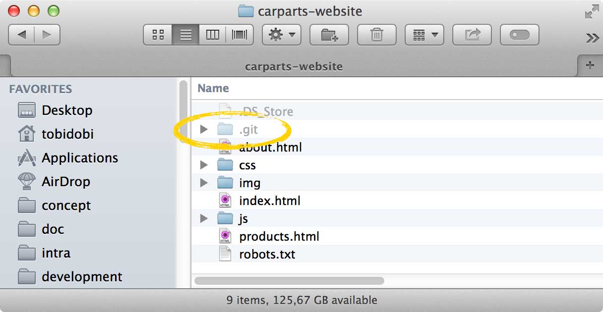 This little ".git" folder is our new, empty Git repository. Please mind the word "empty": Git did not add the current files of your working copy as something like an "initial version". The repository contains not a single version of your project, yet.