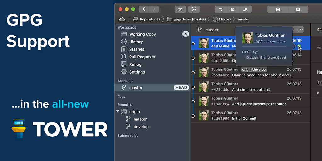 GPG support has now come to Tower: you can connect GPG keys with your User Profiles in Tower, sign commits automatically and see which commits have been signed - and by who. All of that right from within Tower!