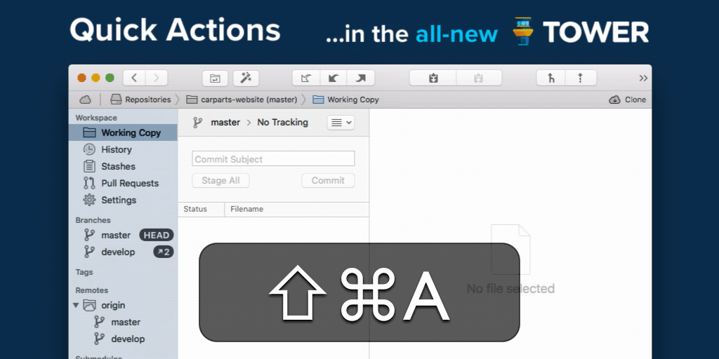 One of Tower’s most popular features is now available on Windows. Quick Actions gives you superpowers: it’s easily accessible with a simple keyboard shortcut (Alt + Shift + A) and gives you instant access to a wide range of actions.