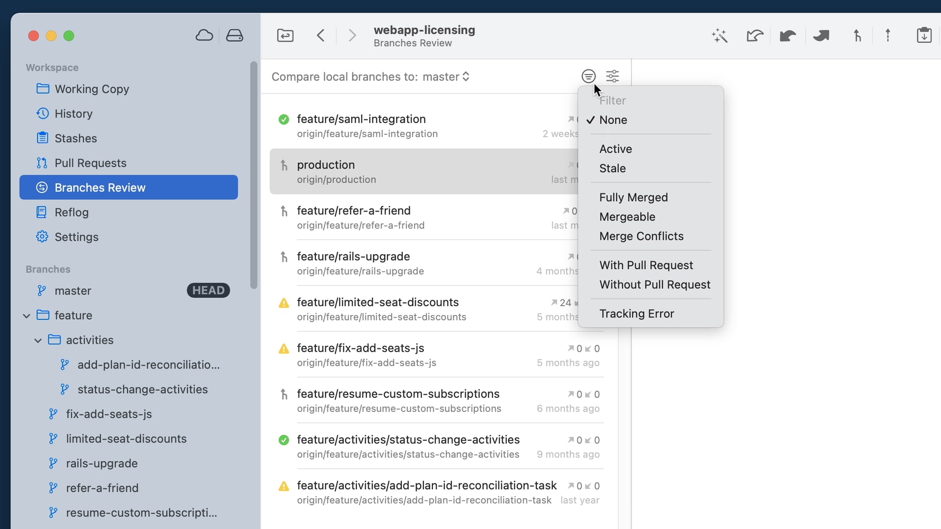 A new view in the Workspace with several filtering options that allows to quickly pinpoint which branches have been stale/obsolete or can be safely deleted.