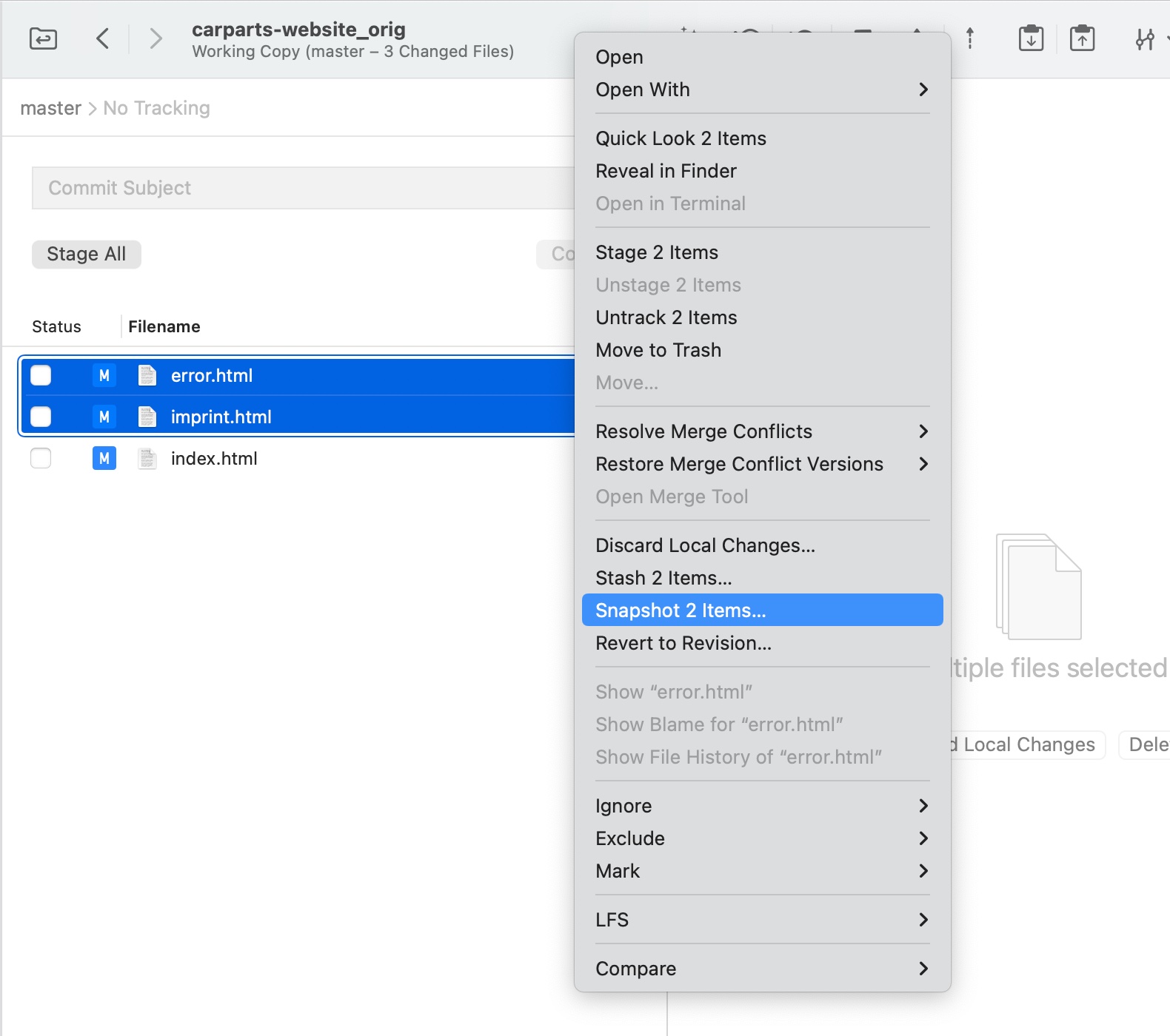You can create snapshots of your entire working copy or capture just a number of modified files. Your work can be retrieved later by accessing the “Stashes” view.