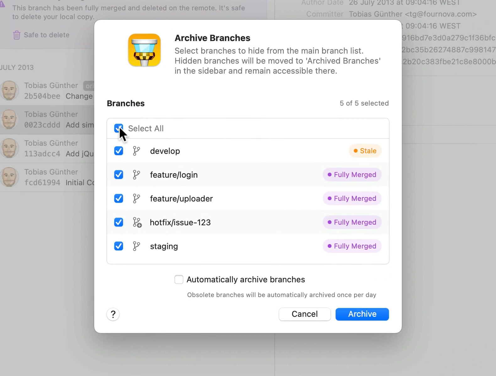 This feature allows you to select and archive multiple branches, which will then be moved to the new "Archived Branches" section in the sidebar.