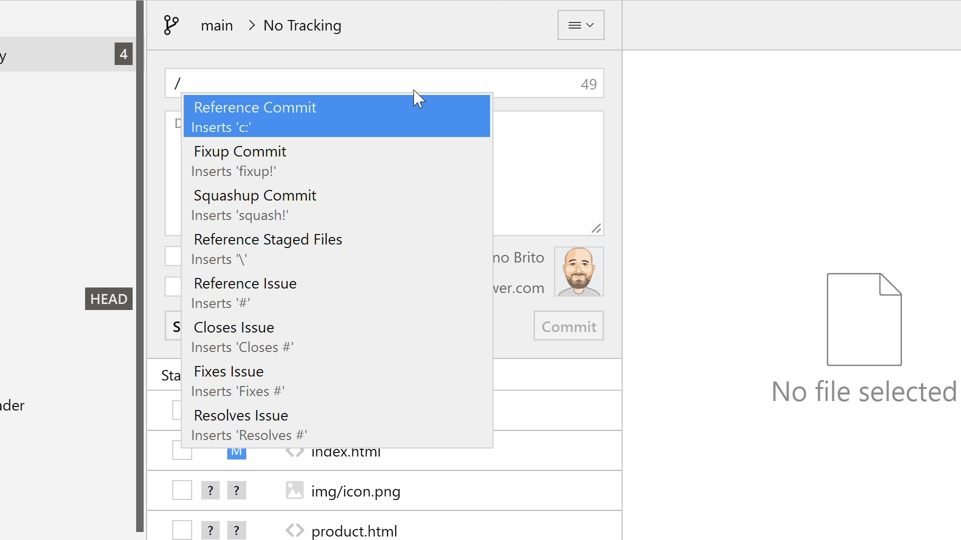 Simply type "/" in the subject or body field to reference files, commits, and issues.